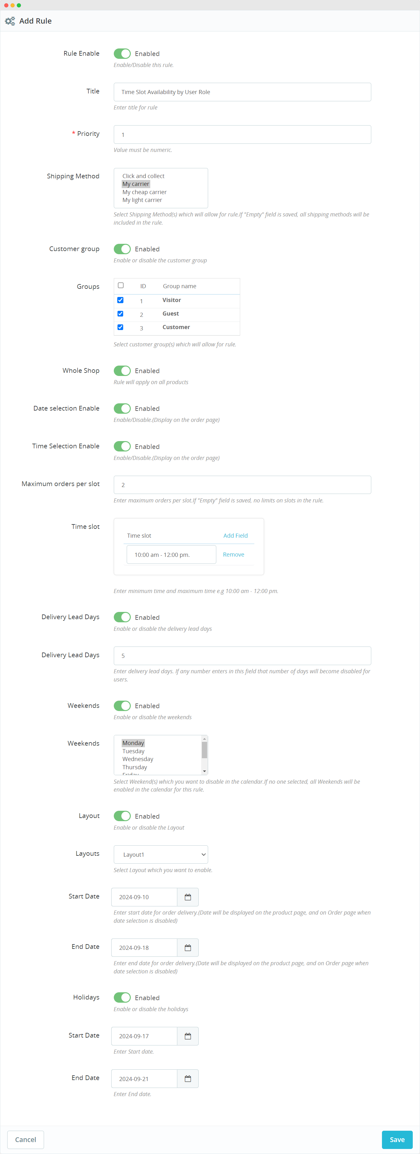 The PrestaShop Delivery Date and Time Slots module allows store owners to provide customers with flexible delivery options by allowing them to select their preferred delivery dates and time slots during checkout. Store owners can choose to create multiple rules for different products, categories, and customer groups. Additionally, you can customize delivery times, manage delivery lead days, and exclude specific dates like weekends and public holidays.
