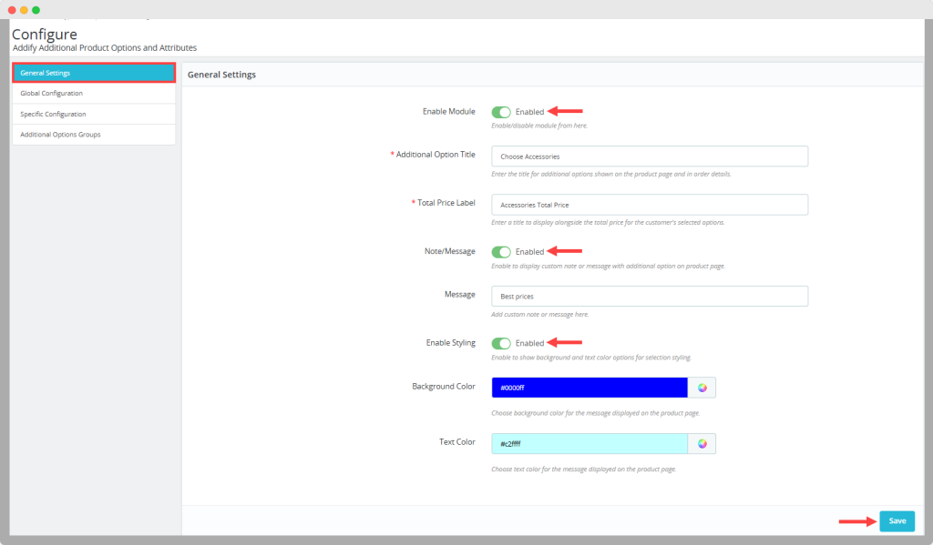1. Activate the module, go to its General Settings. Here you can add custom label for additional option and set its desired text & background color.