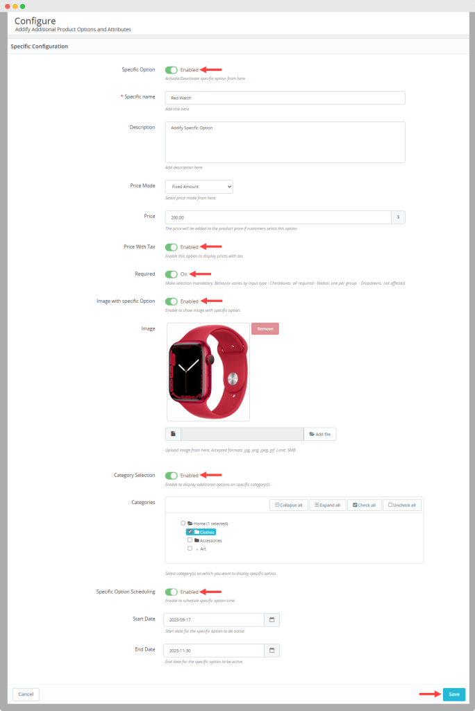 3. Enable specific option, add its name and description. Scroll down and set its price mode as fixed or percentage amount.