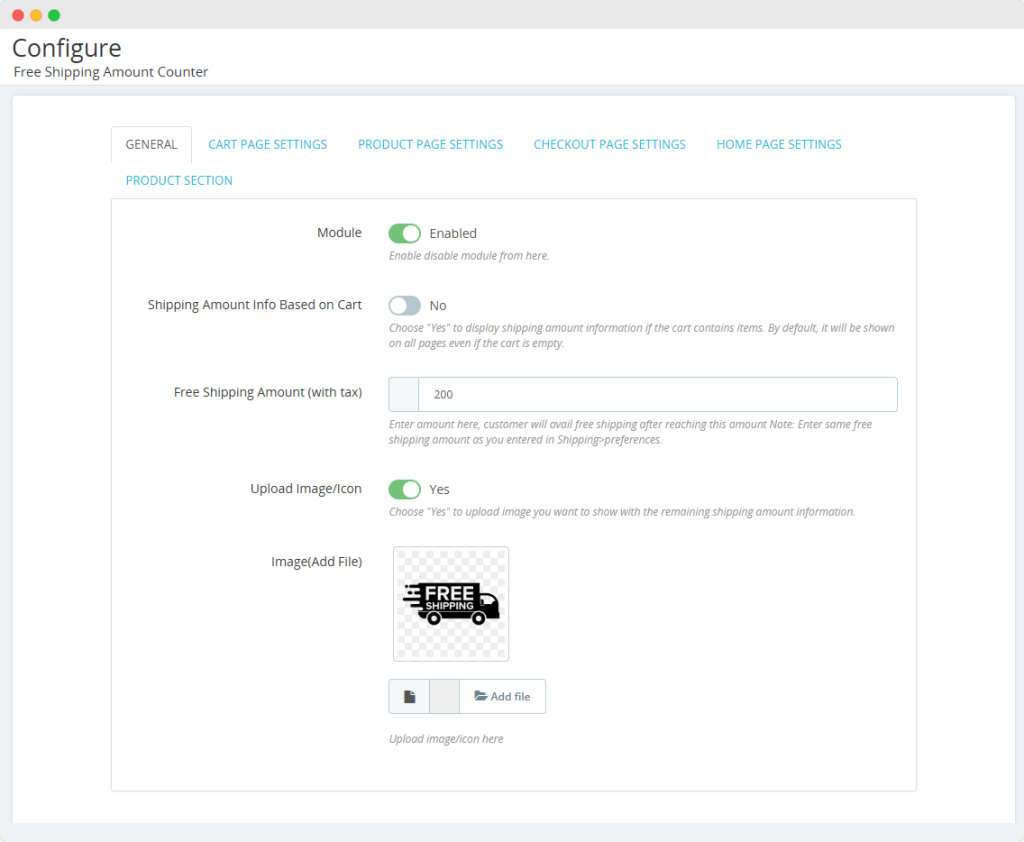- Upload a custom image or icon to display alongside the free shipping amount information