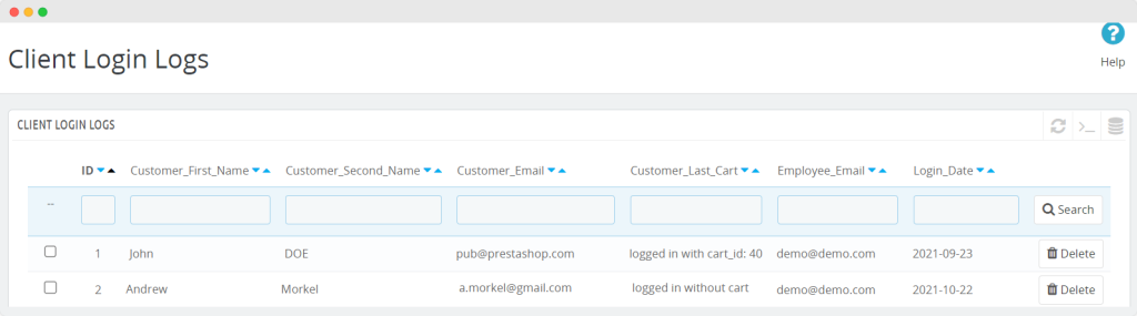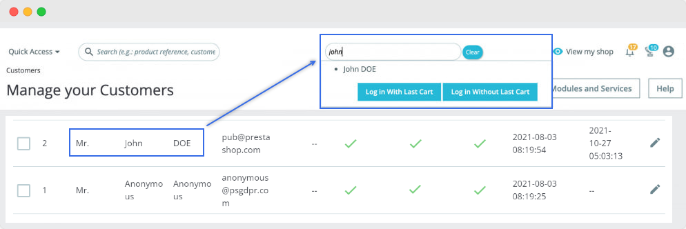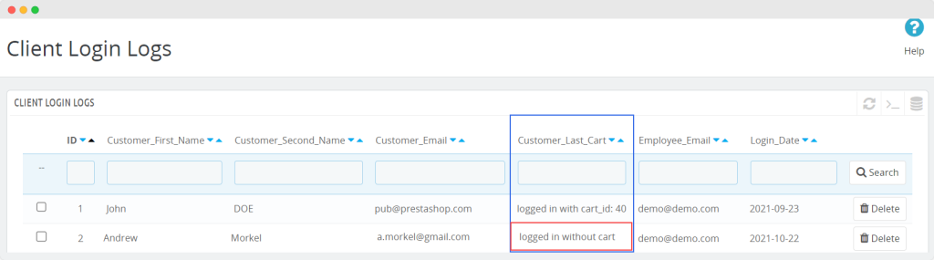 Module has separate customer login log from where you can see new or old logged in users. Here you can also see customer is logged in with cart or without cart.