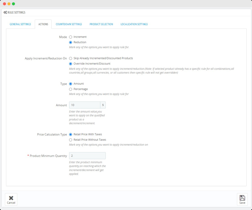 • Add minimum quantity for discount. If 5 is added, the discount or markup will be applied once the add to cart quantity exceeds “5”.