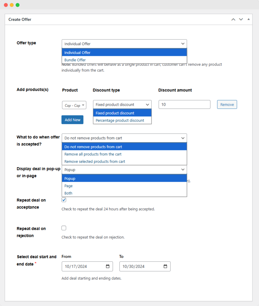 - Choose to repeat a deal if the user rejects it and specify the number of hours after which it will be repeated