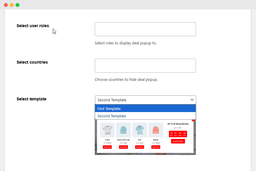 - Choose from the given template options for popups and in-page deals