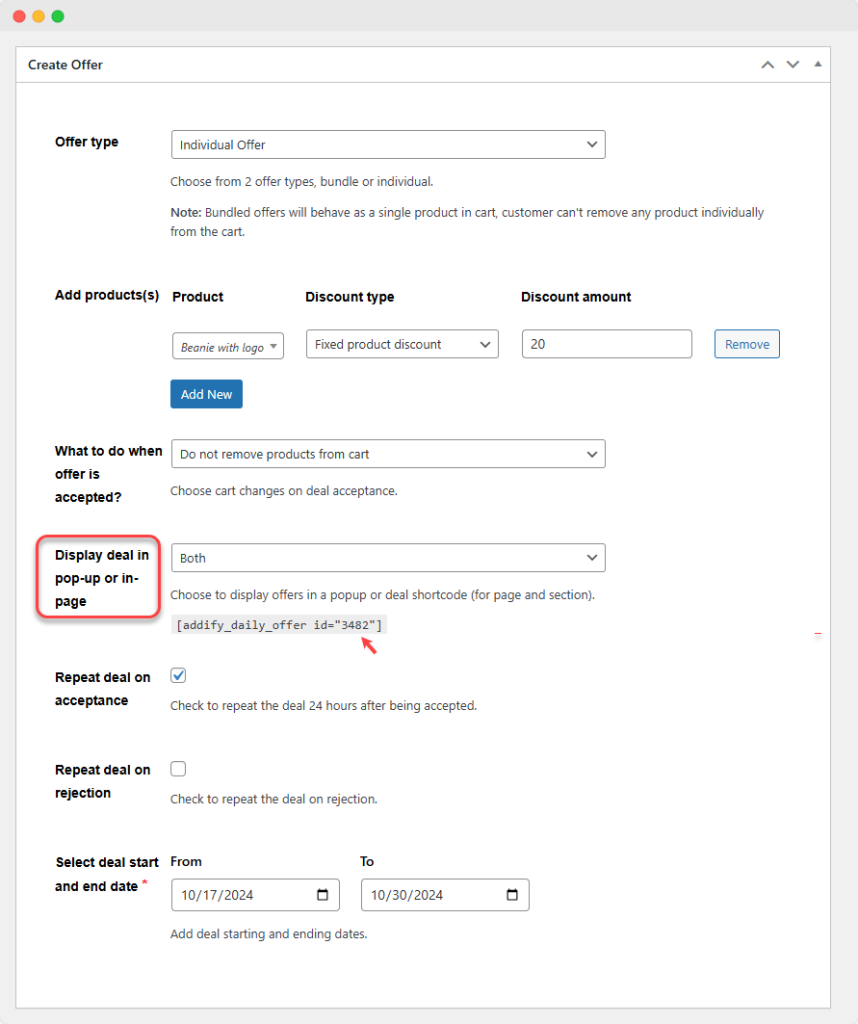 You can choose to display the deal in a popup, in-page format, or both. Once you choose the desired format, you will see a short code for the deal. You can use those shortcodes and paste them on separate pages to create dedicated pages for each deal.