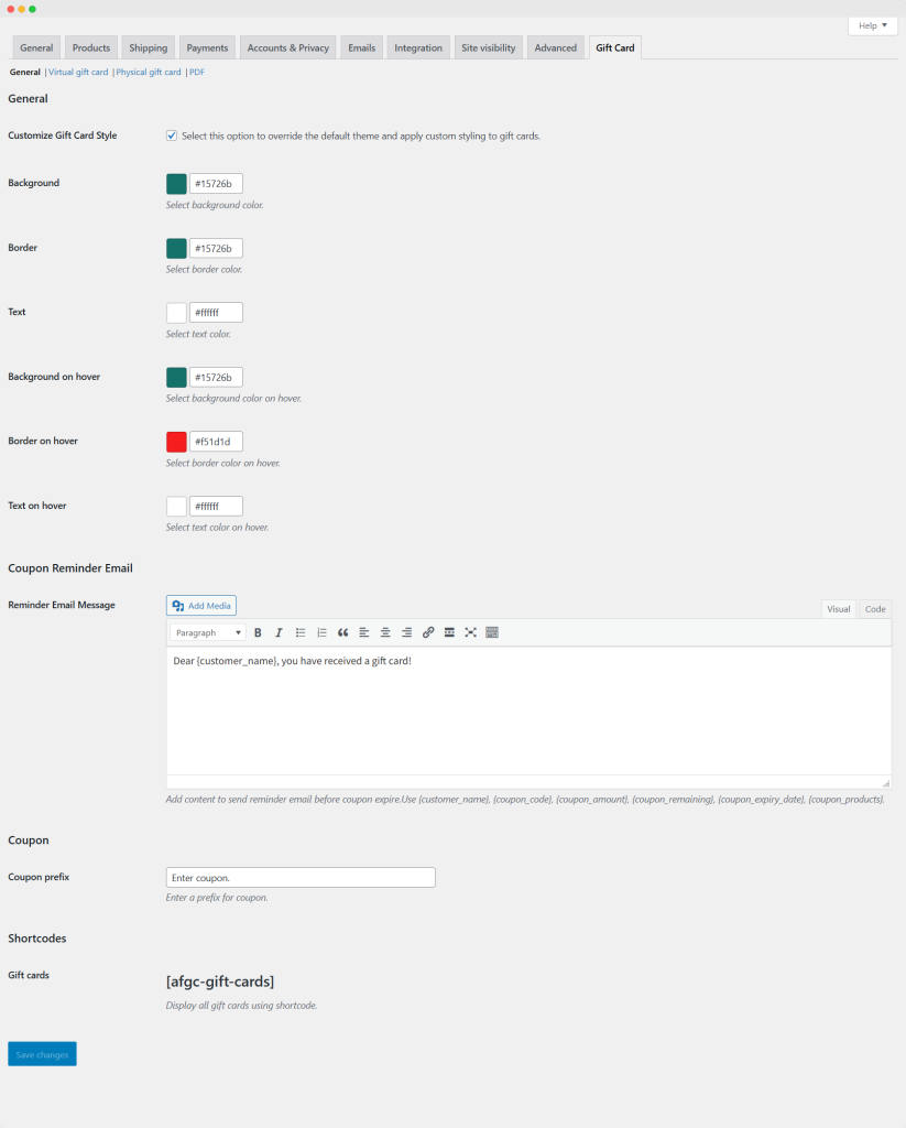 Go to WooCommerce > Settings > Gift Card > General. You have the option to change the default theme styling for the customer gift card in the general settings.