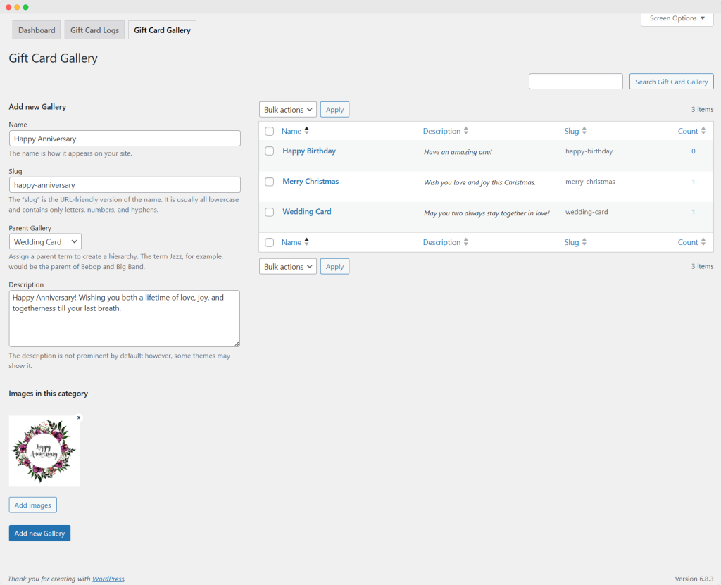 Creating a New Gift Card Gallery