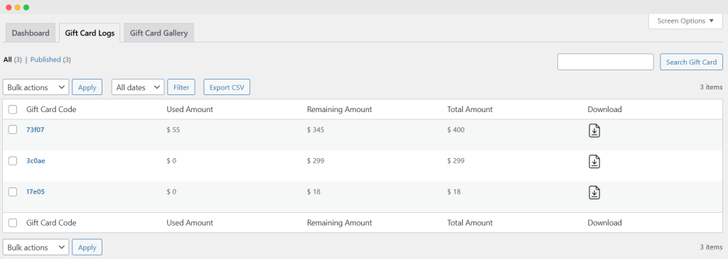 Go to WooCommerce > Gift Card > Gift Card Log to view the gift cards that customers have purchased. In the Gift Card Logs, you can view the following list of information: