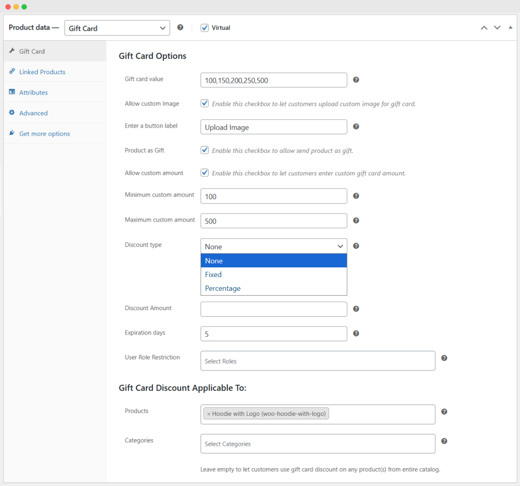 Fill in the product data, choose the Gift card option from the drop-down menu, and now customize the following gift card options: