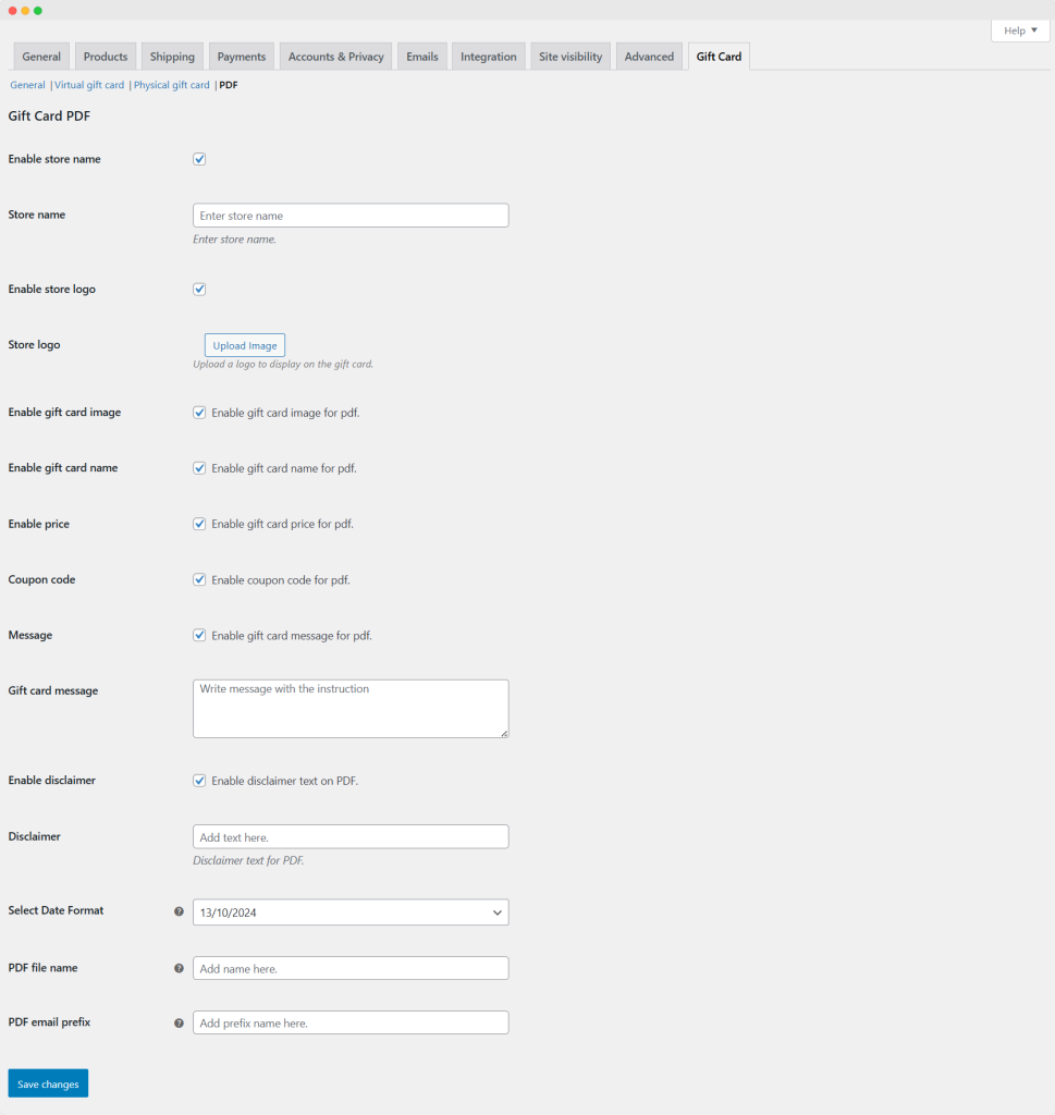 Go to WooCommerce > Settings > Gift Card > PDF to configure PDF gift card settings. These settings include: