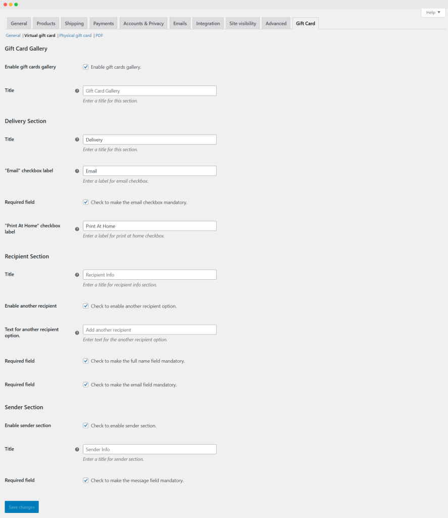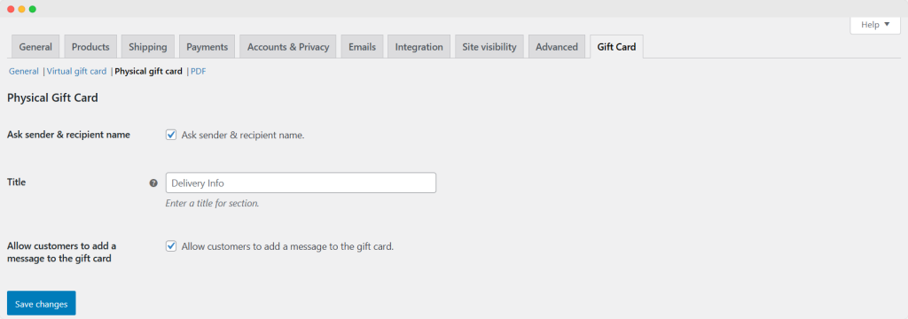 Go to WooCommerce > Settings > Gift Card > Physical Gift Card to customize a physical gift card. Use the following options to configure the Physical Gift Card settings: