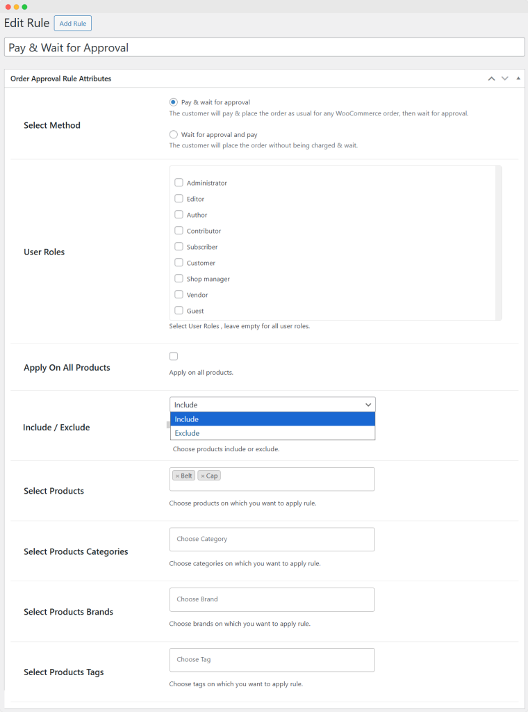 By following these steps, you can create order approval rules with the specified attributes, defining how order approval will be handled for different user roles, products, categories, and tags. These rules provide flexibility in managing order approval status in your WooCommerce store.