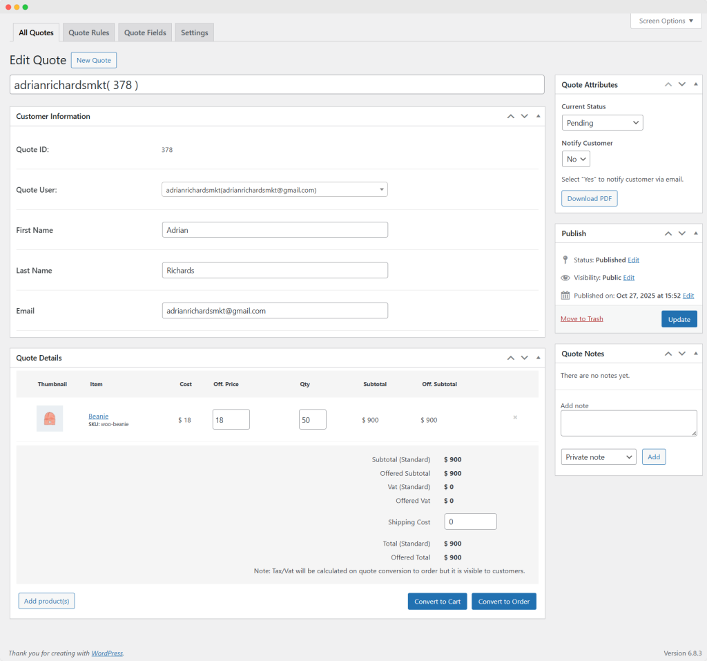 - Go to WooCommerce > Request a Quote > All Quotes.