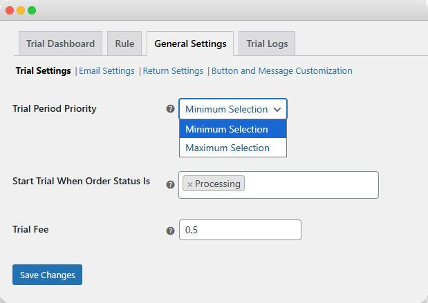 To charge customers for each trial, you can use WooCommerce Try Before Buy extension. It can be setup within minutes. Go to General Settings > Trial Settings and navigate to Trial Fee. Here you can add any custom amount to charge for each trial. Follow the steps below for a detailed overview: