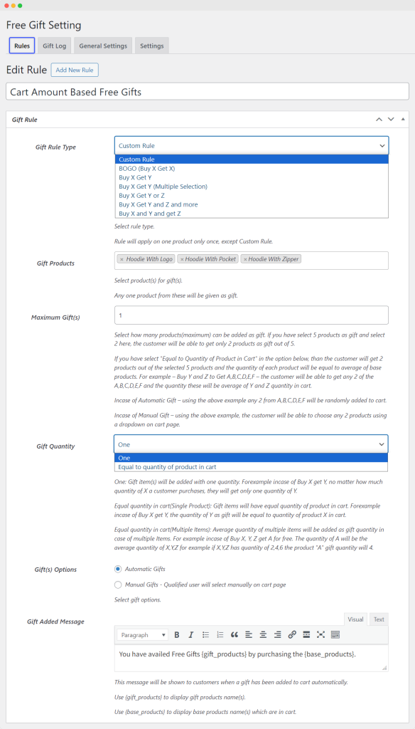 Proceed to configure the gift settings based on your preferences. This includes selecting the gift product(s), setting the maximum number of gifts, and choosing whether the gifts should be added automatically or manually.