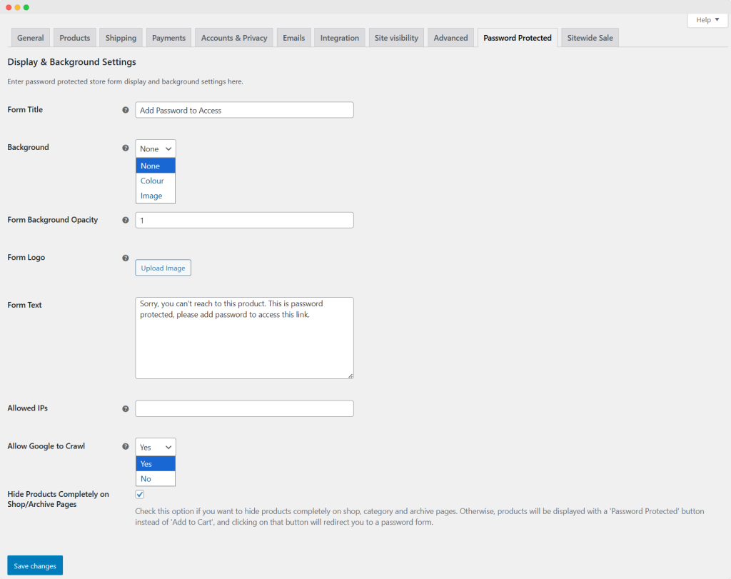 Go to the WooCommerce settings → Click on the Password protection option and apply the following settings: