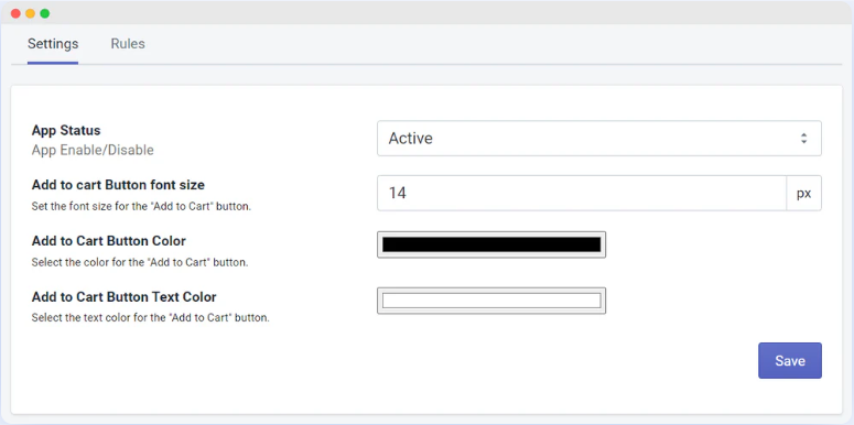 Go to the Settings option and adjust the “Add-to-Cart” text font size, text color, and button color. This will set up the button’s visuals as you like and create a custom add to cart button in Shopify.
