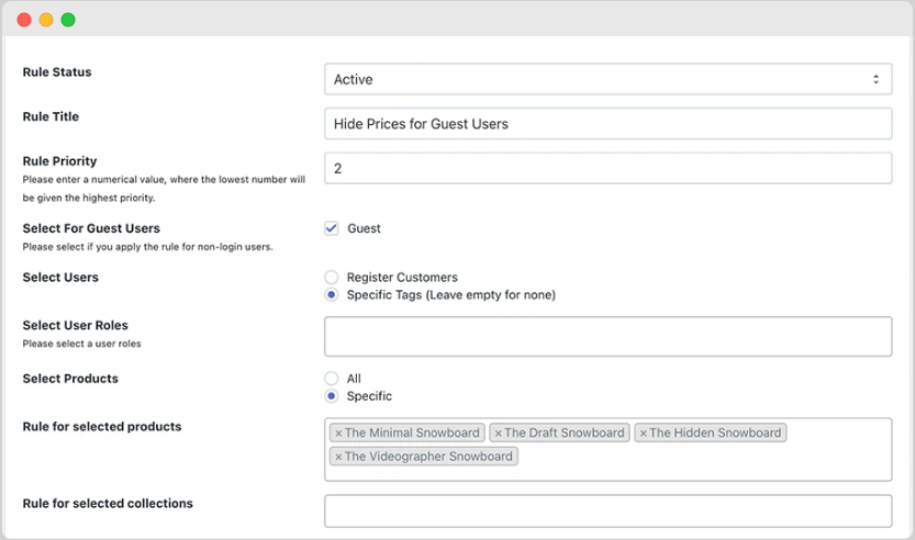 - Select products, collections, users, and user roles to apply rule