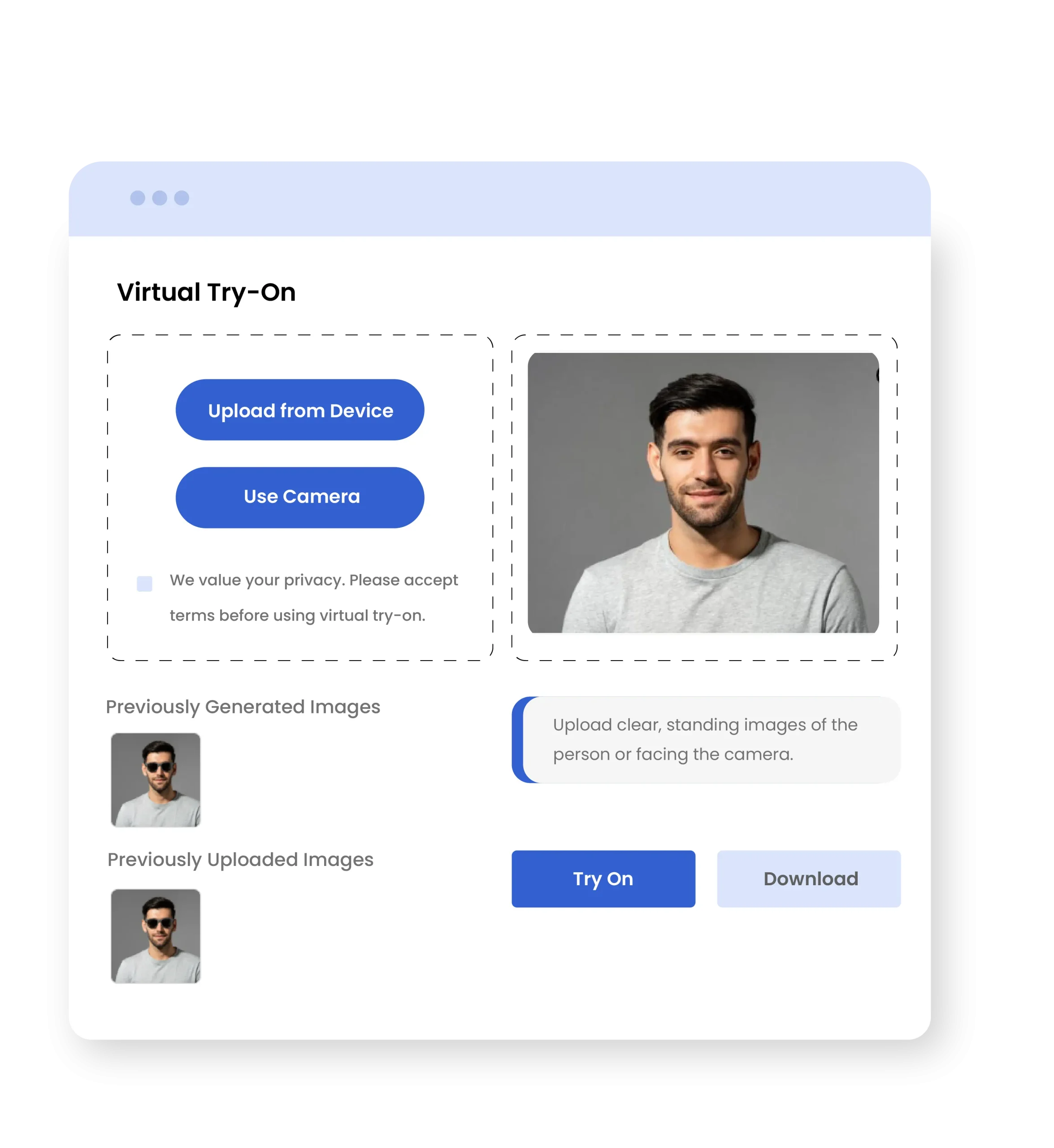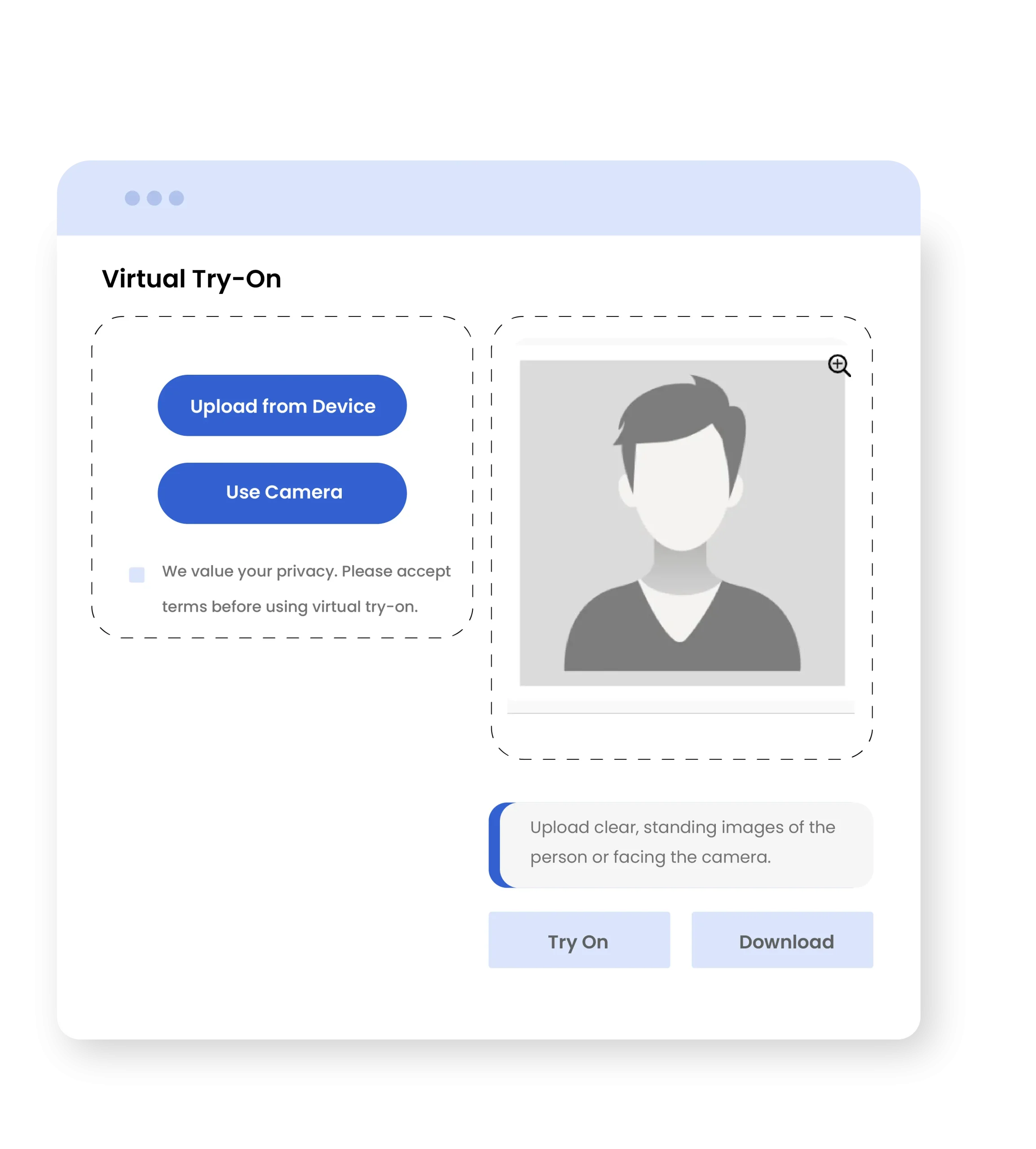 Admins can provide customers the option to either upload an existing image or use the camera to click a new one. This means users can easily try on multiple items, compare different styles, and see how each product looks on them in real time.
