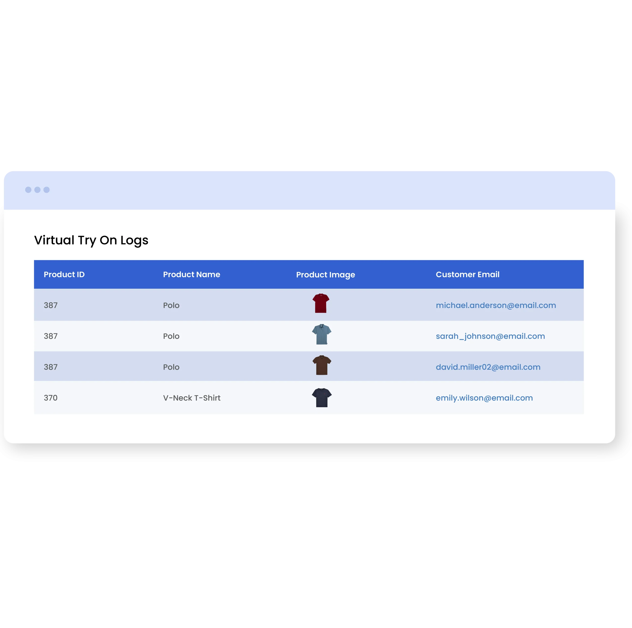 View and manage a dedicated try-on log to monitor essential details such as Product ID, product name, product image, and customer email. This allows you to keep track of customer interactions and maintain records.