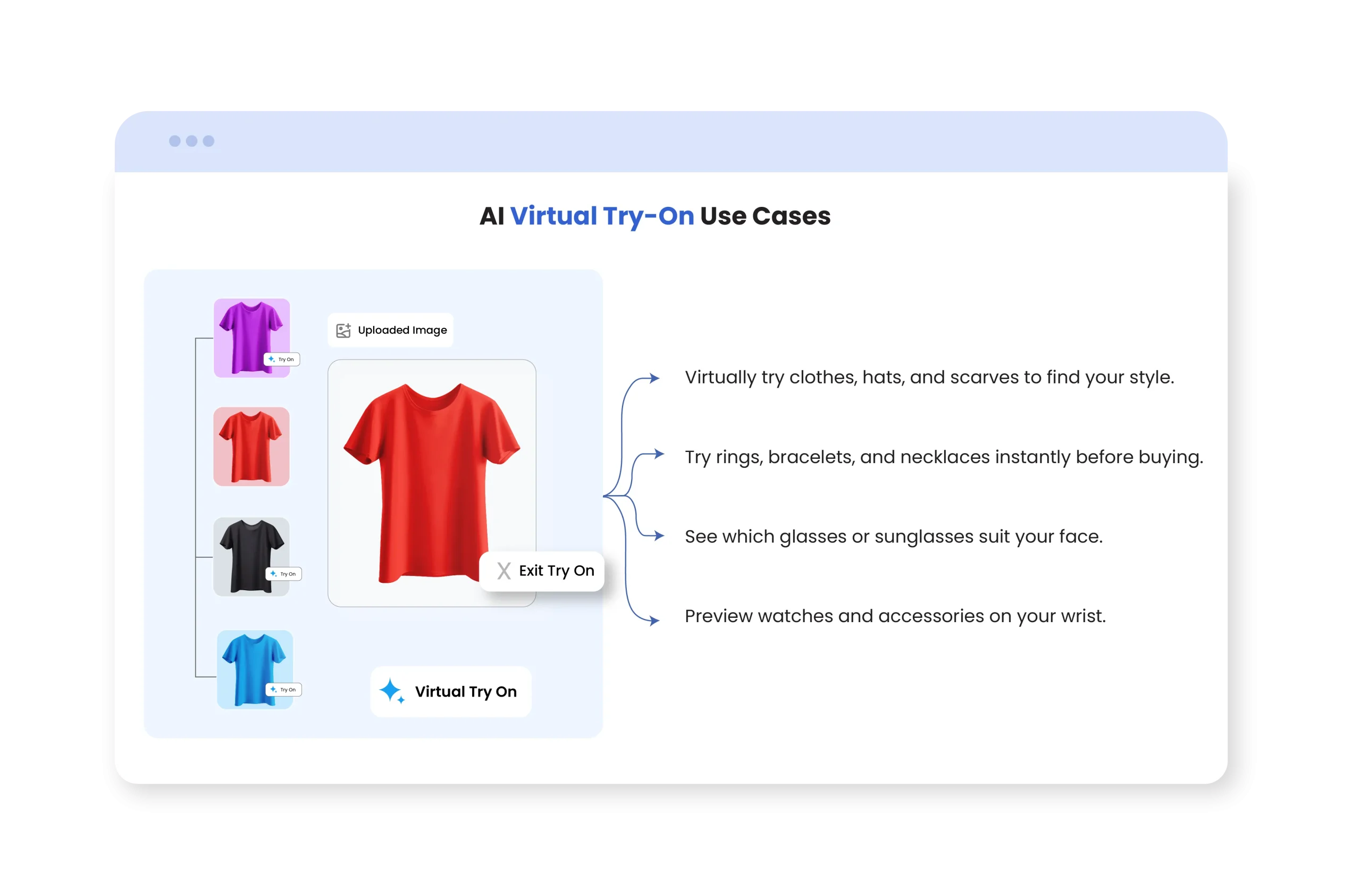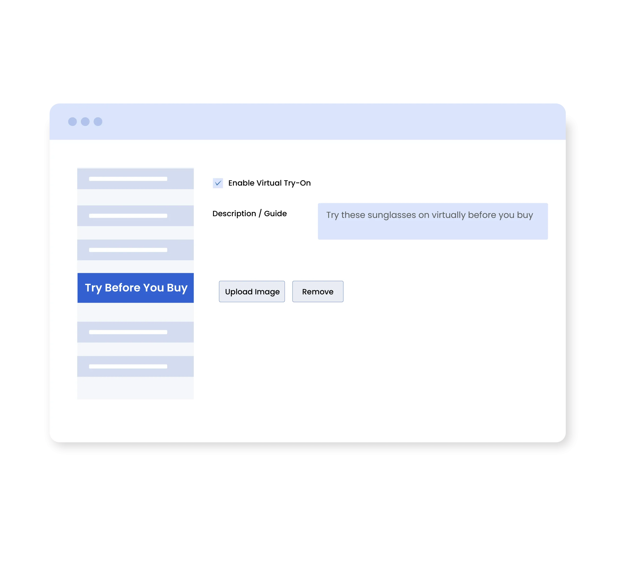 You can simply display a try-on popup and allow users to either upload an existing image or click a new one. Customers can easily compare different styles, clothes, accessories, and more. With just one quick feature, you can provide a personalized shopping experience, boost customer engagement, and drive more sales.