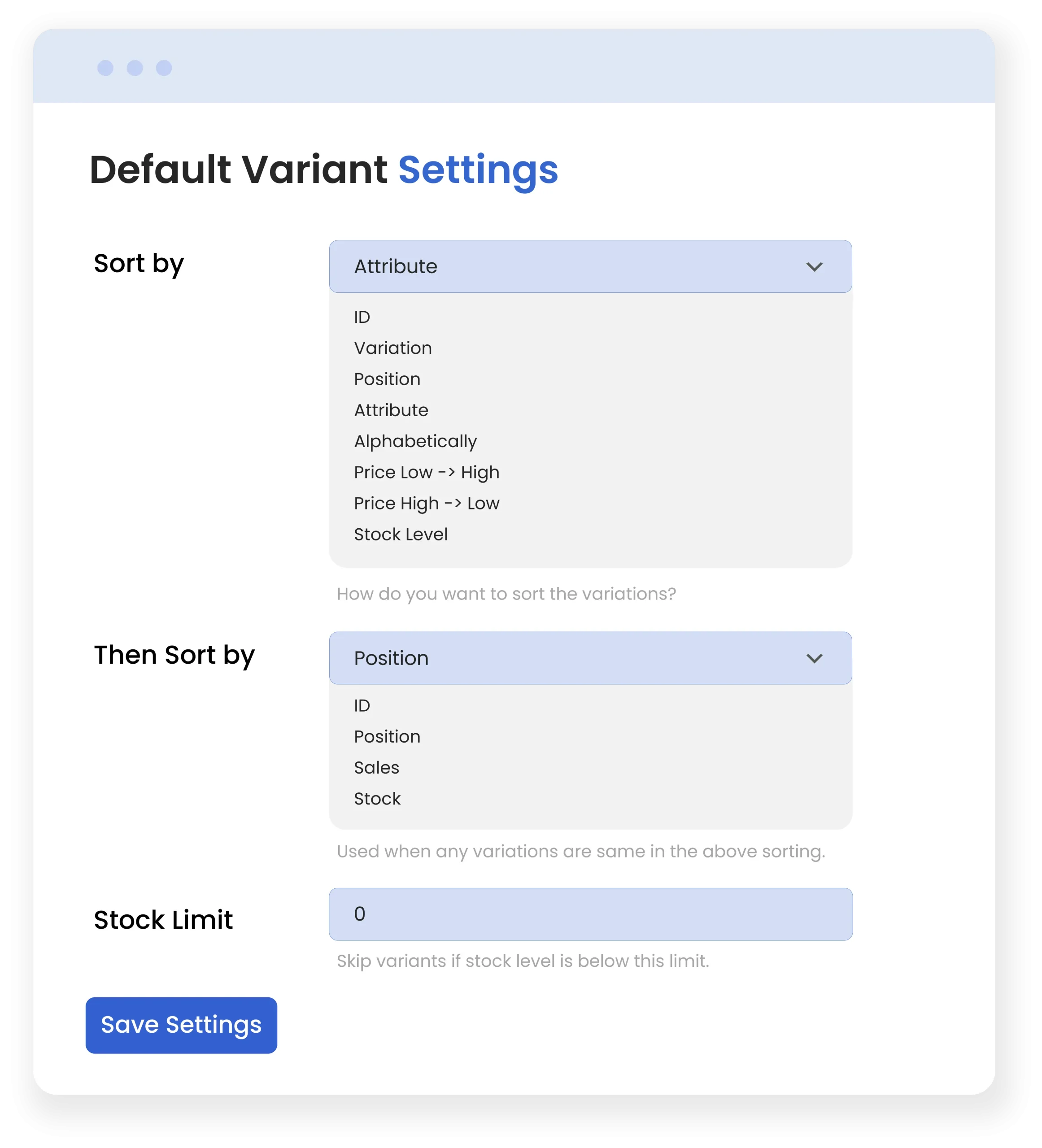 This plugin allows you to customize the default variation based on your needs. You can sort the default variation by position, attribute order, ID, alphabetical order, price (high or low), and stock availability. A secondary variation to be selected if the primary variation is insufficient. Additionally, you can define a stock limit to skip variations that fall below the specified limit.
