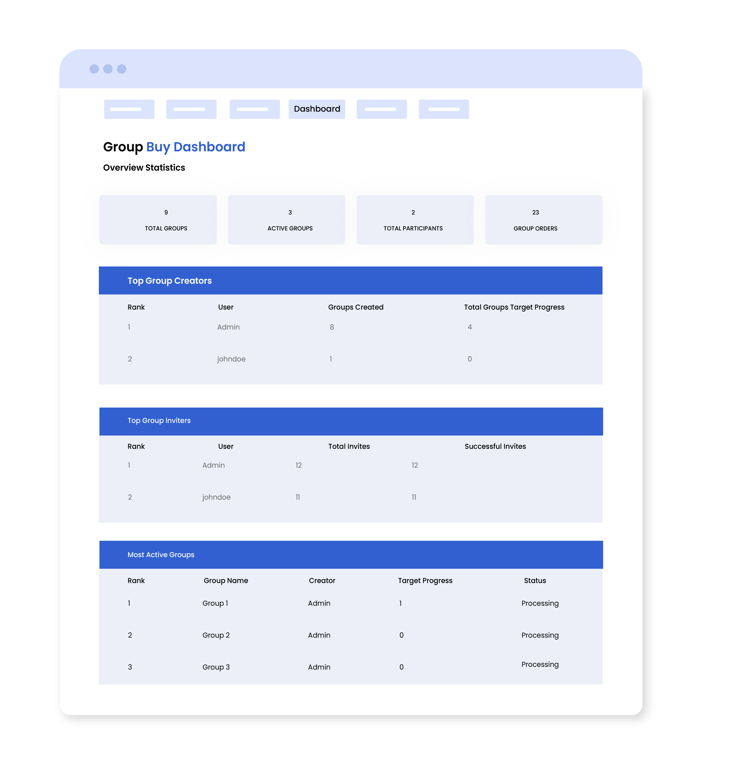 With this feature, the admin can view stats including total groups, active groups, participants, and orders. It also highlights top creators, inviters, and active groups for easy monitoring.