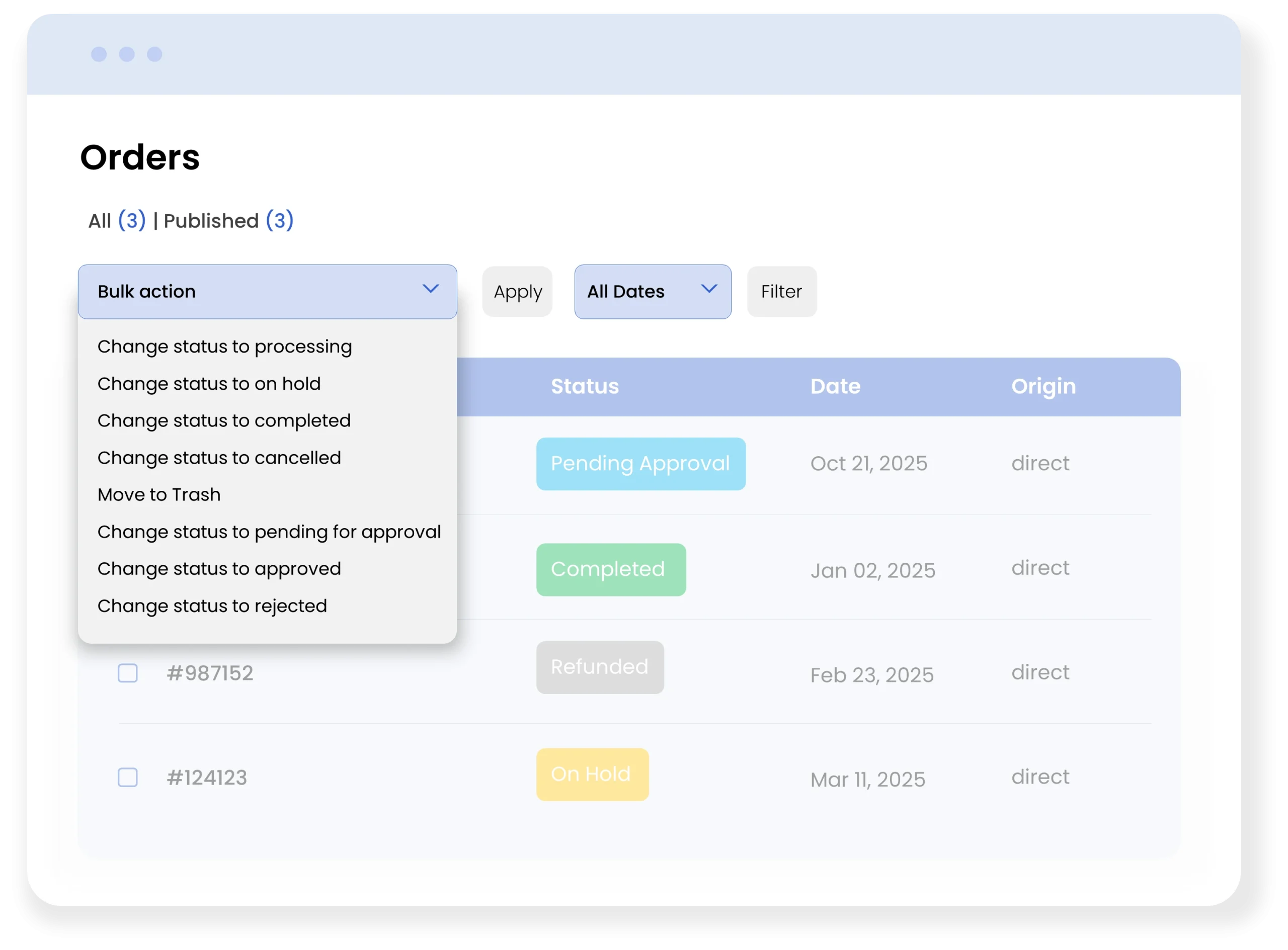 With Order Approval for WooCommerce, you can easily manage multiple orders in Bulk from the order page. You can change the order status according to your choice.