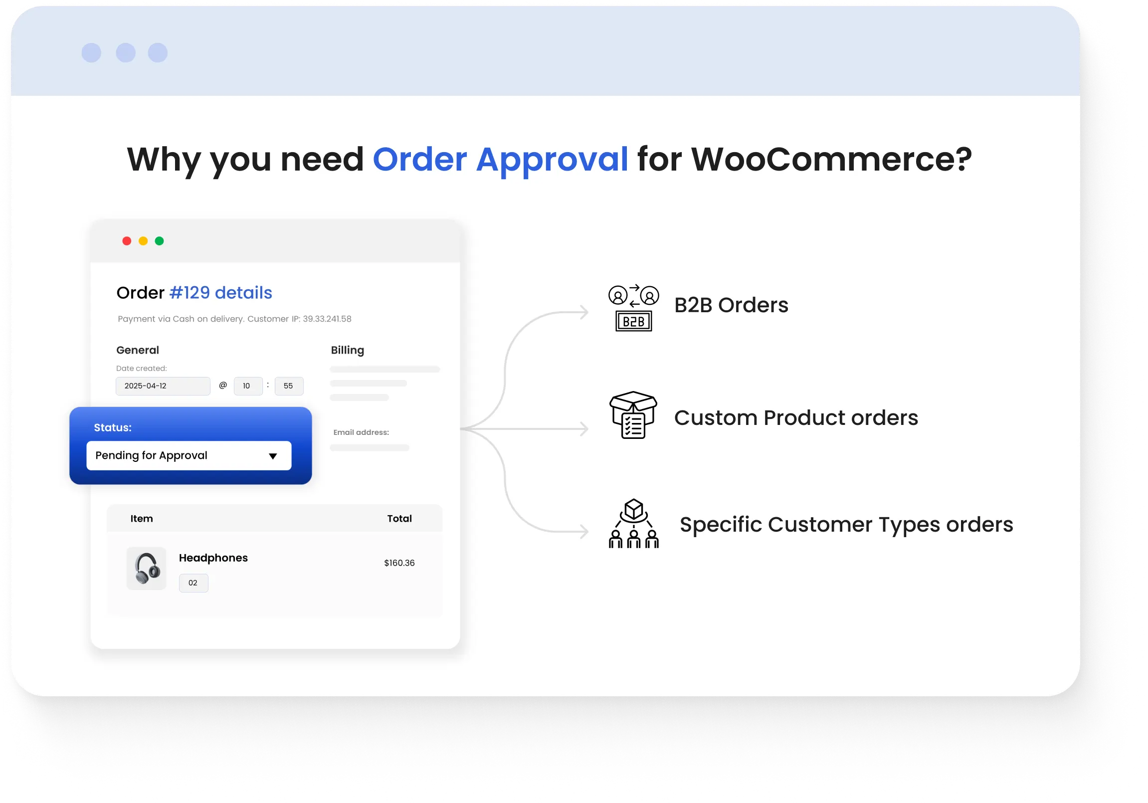 Order Approval for WooCommerce plugin allows shop owners to manually approve new orders based on user roles as well as products in the cart. You can choose to accept payments before or after orders are placed, personalize checkout messages, alert customers when their orders have been approved, and display an order status update visually on My Account page.