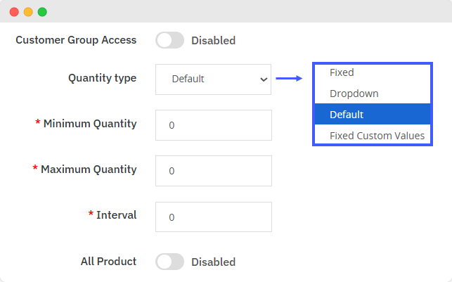 - Set maximum, maximum, fixed, and interval-based quantity selection stepsÂ