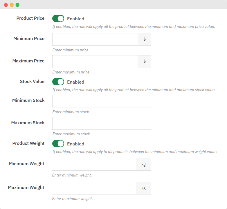 Apply quantity rules for productâs specific price, weight, or stock value. Set higher quantity limit for low-cost items, restrict quantity for heavyweight products, and easily manage logistics and overall inventory.