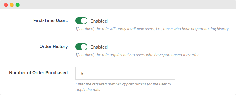 Trigger unique quantity conditions for first-time buyers. Simply set limits for new buyer discounts, free samples, or prevent bulk purchases on first order.
