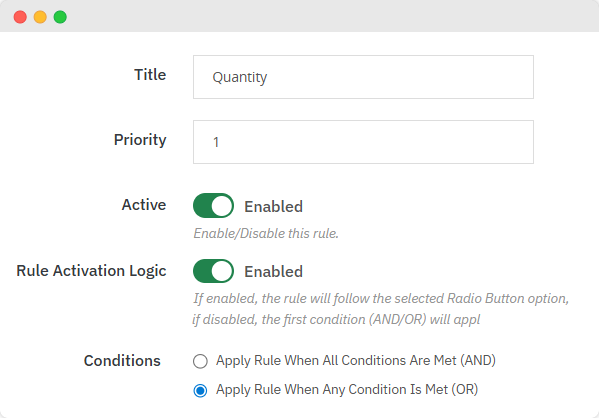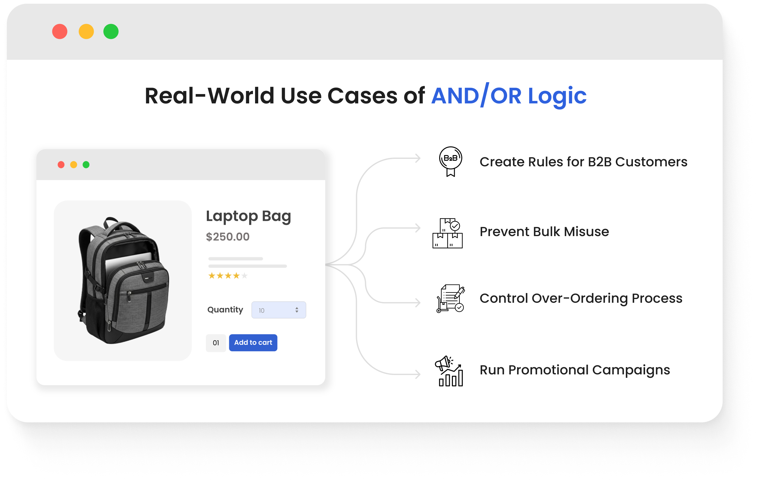 Moreover, you can use AND/OR logic to apply quantity-based conditions on factors like product price, weight, stock value, customer order history, and more. Simply restrict users from over-purchasing promotional, premium, heavyweight, or customizable items. With multiple quantity rules, you can easily target B2B or regular customers and maintain entire stock according to your preferences.