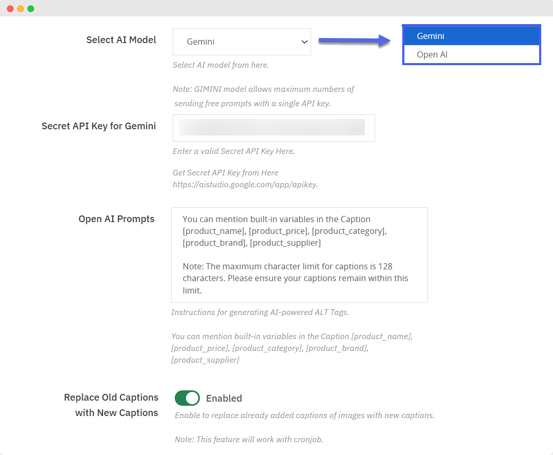 Writing Alt text for multiple items can be time-consuming and often leads to poor SEO. To solve this PrestaShop Ai Alt text generator module allows you to create Alt text for items in bulk. You can simply replace old captions with new ones within minutes. The module works on two major Ai modules, ChatGPT and Gemini. You can select the desired Ai module and create image caption rules for specific products and categories.
