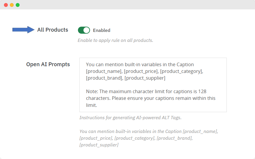 You can create unlimited rules and select desired Ai model to generate alt text for all or specific products. Shop managers can choose any suitable language and create useful prompts in order to get relevant results. You can also customize image tags using dynamic variables like product name, brand, supplier, manufacturer, etc. With just one quick setting, you can replace old captions with new ones, schedule rules as needed, and manage the entire Alt text optimization with ease.