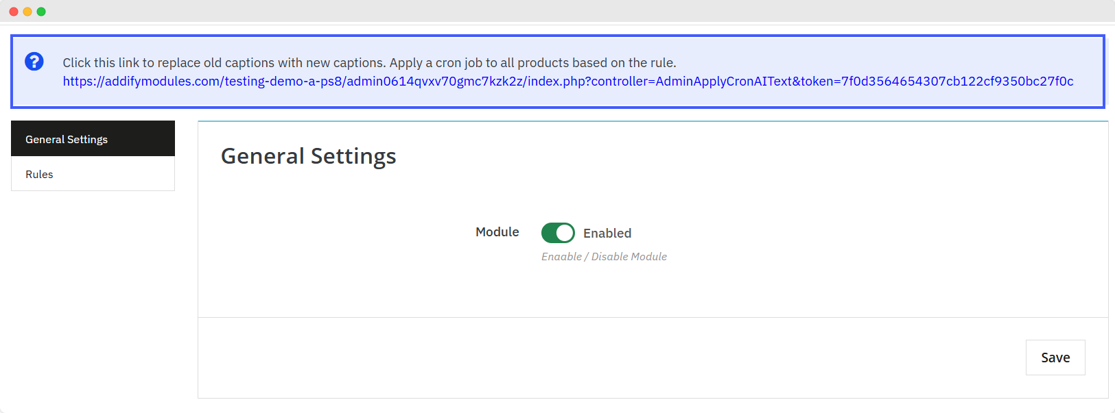 To generate Alt texts automatically PrestaShop Ai Alt text generator module allows you to run a cron job for each rule. In this way, your store’s alt tags will remain updated, and you dont need to put any manual effort into it. Simply just create a rule, select desired Ai model, input a powerful prompt, and Voila! Your SEO-friendly alt texts are generated within minutes.