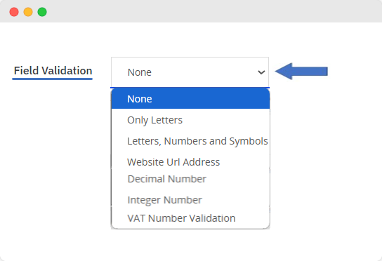 Easily control what customers can enter with smart validation options. Validate names, website URLs, VAT numbers, emails, decimal and integer numbers, letters only, or letters with numbers and symbols.