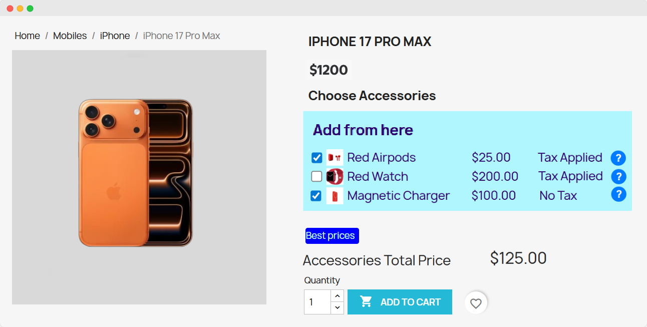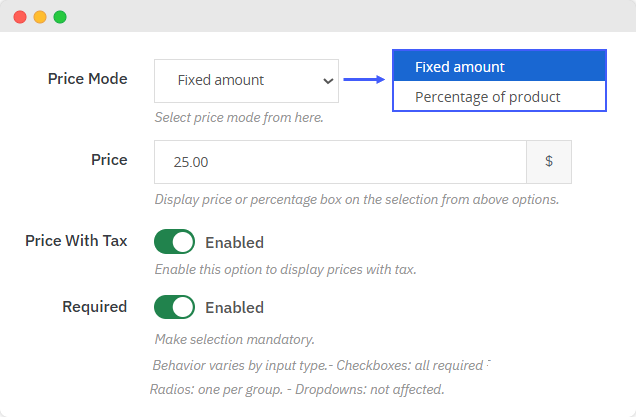 - Choose to add fixed or a percentage-based fee for each product add-on