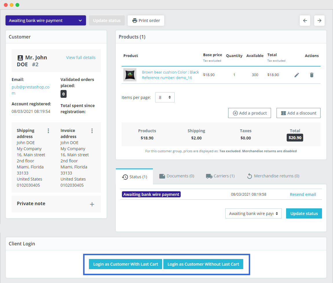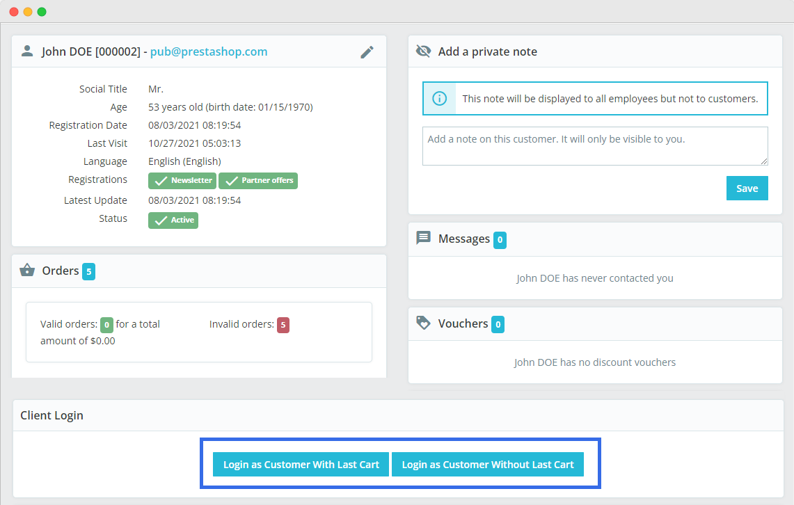 In addition to this, PrestaShop Login and Shop as Customer also provide you with the ability to log in as a customer, with the choice of with or without the last cart.