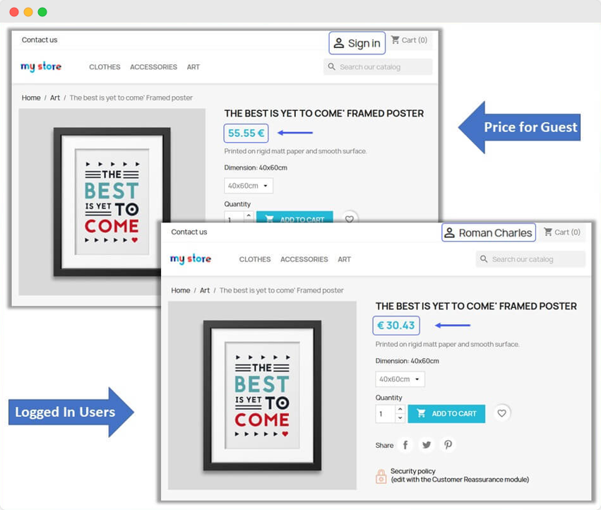 PrestaShop Price by Customer Group and Country module gives you incredible flexibility to offer custom prices to different user roles. In this way, you can increase or decrease price ranges for Regular, New, and B2B customers; whether they shop in bulk or select individual items, you can easily offer prices based on product quantity, stock, weight, and more. In this way, you can design special offers and discounts for certain user roles and encourage customers to make repeated purchases from your store.