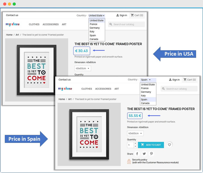 Sometimes, specific item demand is significantly higher in certain countries compared to the rest, and this scenario requires a custom pricing structure. With the Prestashop country-specific Pricing module, you can increase or decrease prices based on specific countries and make it available for desired user roles. In this way, you can set prices according to multiple tax rates and offer discounts in countries with lower sales.