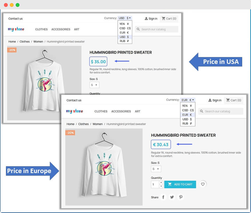 In this way, you can manage bulk order discounts, product inventory, latest exchange rates and offer low prices for slow-moving items in specific countries. Moreover, you can display a countdown clock on the product page and inform customers about the upcoming special price offers. Simply optimize the whole pricing structure and attract new buyers to your store.