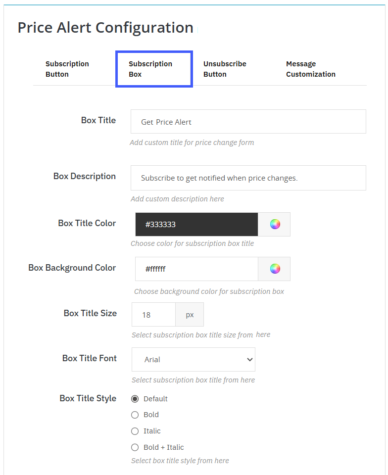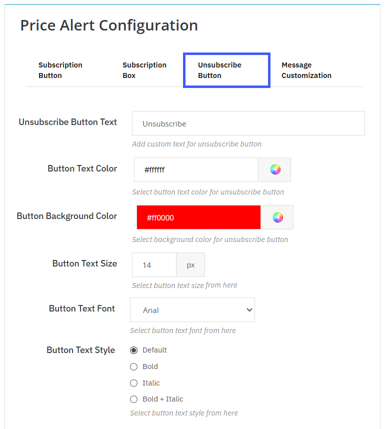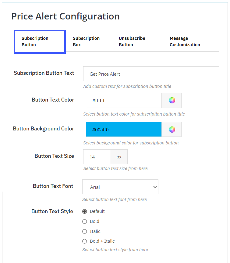 With this module, you can fully customize the subscription buttons for both stock alerts and price change alerts, giving you control over text, appearance, and style to match your brand. You can set the button text as “Notify Me” for stock alerts or “Get Price Alert” for price changes to communicate the action to users clearly. Visual customization options include selecting the text color, background color, font, text size, and text style (Default, Bold, Italic, or Bold + Italic). Making your call-to-action button visually appealing and engaging.