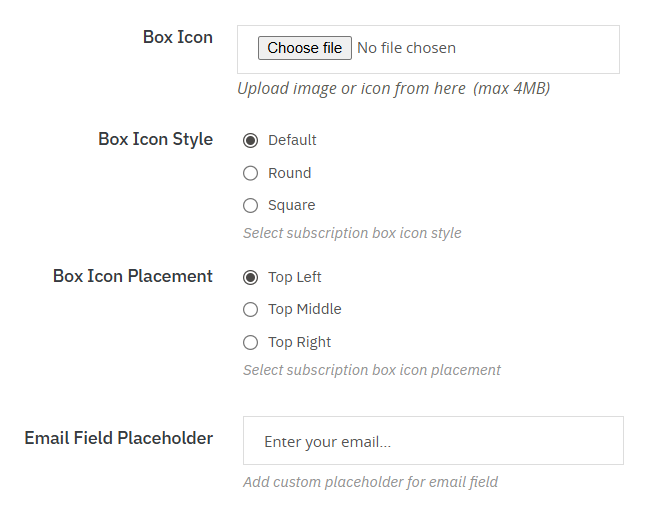 - Upload and display a custom icon for the subscription box with selected styles, such as default, rounded, or square.