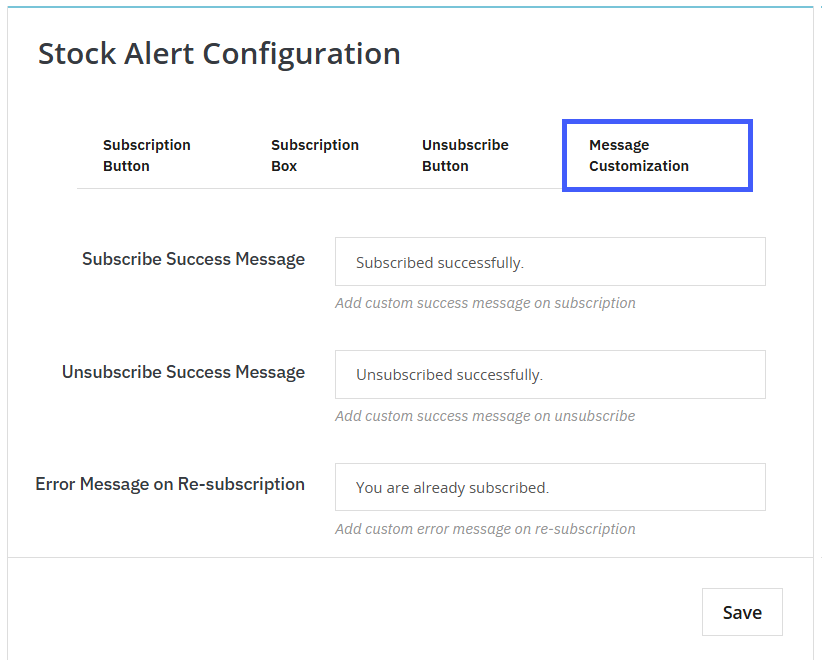 This module allows you to customize user feedback messages for both stock alerts and price change alerts. You can define a subscription success message (e.g., “Subscribed successfully”) to confirm when a user signs up for either alert type. Similarly, an unsubscribe success message (e.g., “Unsubscribed successfully”) provides clear confirmation when users opt out. Additionally, an error message for re-subscription ensures users are properly informed if they attempt to subscribe again.
