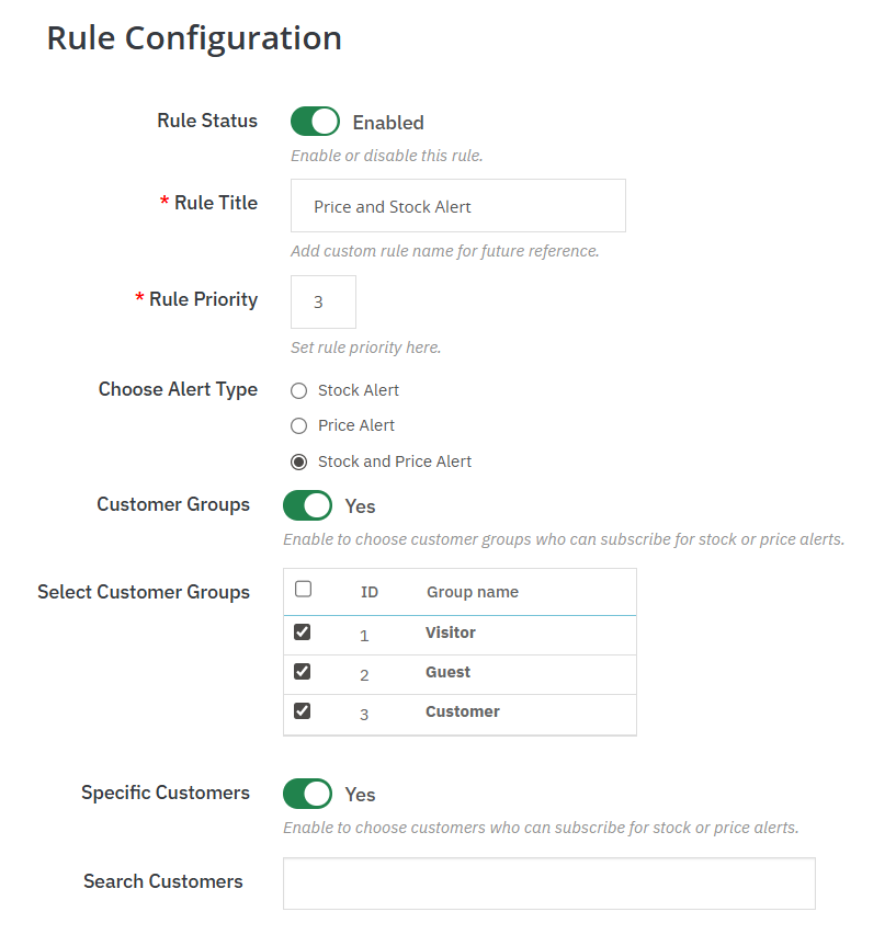 The module enables merchants to develop infinite rules of alerts and have full control over how notification works out. To prioritize between different rules, you can choose priority per rule, and the alerts you would like to apply first are selected. This is to say that you have control over who is to be subscribing to the alerts, like certain customer groups or individual users, what products should be woken by the alerts, and on what terms, say, stock levels of certain products or price levels.