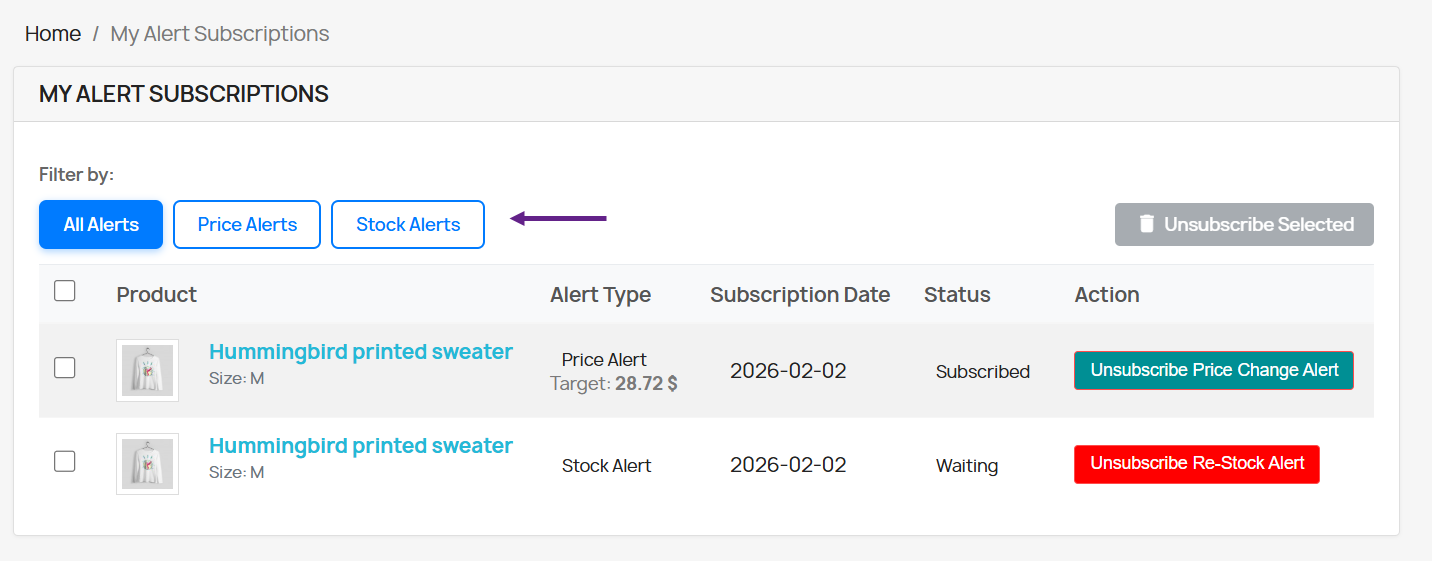 - Access detailed Stock Alert logs, including customer name, email, product, and date