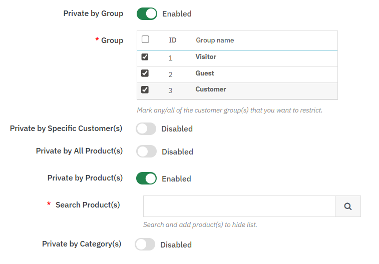 Admins can control the privatization of specific products and categories based on: