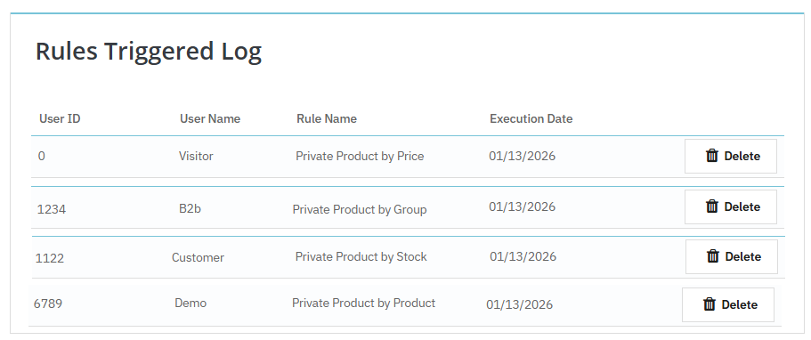 Merchants can enable or disable rules anytime and maintain full control over product visibility. Moreover, you can view user details such as ID, name, and purchase date from a separate log for better tracking and complete management.