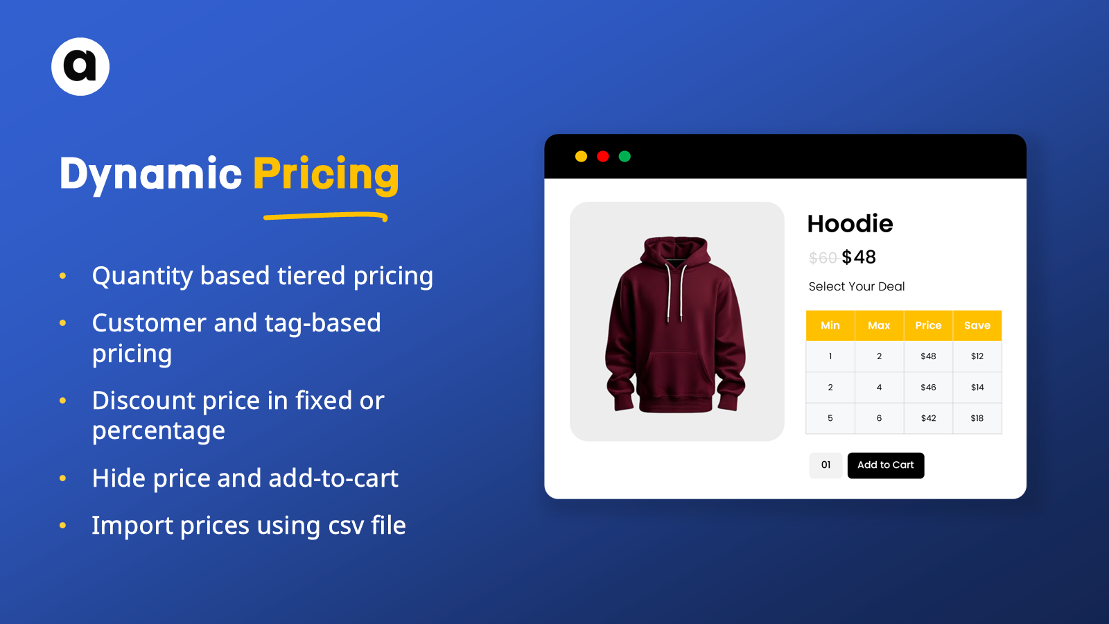 Shopify Dynamic Pricing extension allows store owners to offer pricing discounts and simplify the product selection by all or specific items from the collection. The extension allows you to showcase tiered pricing for selected products, customers, & tags to apply discounts based on quantity or customer groups. Choose to hide and replace price and add to cart button and customize priority for Shopify bulk discount with CSV or custom rules.